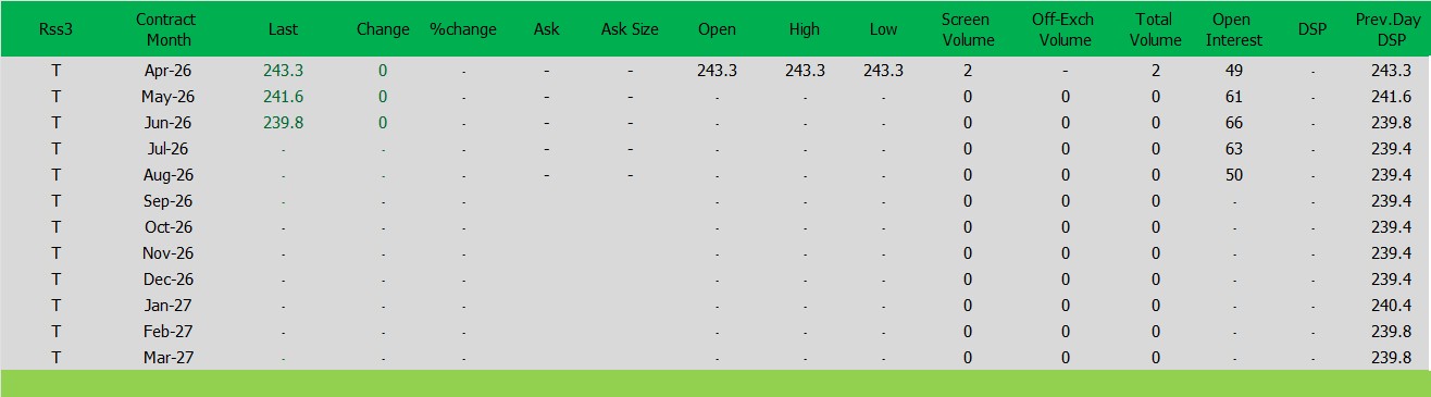 ราคายางRSS3 ตลาดยางSICOM ราคาส่งมอบเดือน เม.ย.ปิดที่243.3 เซนต์สหรัฐ ราคาลดลง 0 เซนต์สหรัฐหรือ คิดเป็นเปอร์เซนต์ +0.00% %