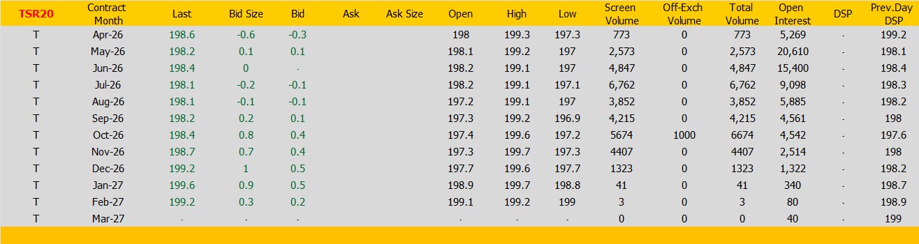 ราคายางTSR20 ตลาดยางSICOM ราคาส่งมอบเดือน เม.ย.ปิดที่198.6 เซนต์สหรัฐ ราคาลดลง -0.6 เซนต์สหรัฐหรือ คิดเป็นเปอร์เซนต์ -0.30% %