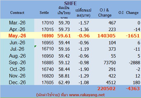 สัญญา(SHFE)ที่เปิดสถานะ(OI) ก่อนหน้า 224,865สัญญาสัญญาที่เปิดสถานะ(OI)วันนี้220,502สัญญา ลดลง -4,363สัญญา