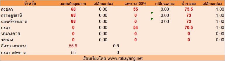 จังหวัด สุราษฏร์ธานี ยางแผ่นดิบคุณภาพ 3 = 68บาท/กก. ราคาไม่เปลี่ยนแปลง เศษยาง 0บาท/กก. ราคาไม่เปลี่ยนแปลง บาท/กก. น้ำยางสด ราคา ณ โรงงาน 73บาท/กก. ราคาเพิ่มขึ้น 1.00บาท