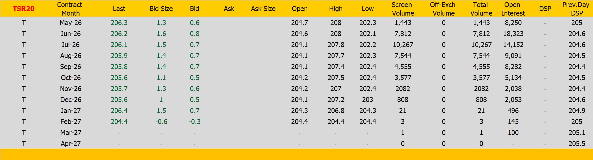 ราคายางTSR20 ตลาดยางSICOM ราคาส่งมอบเดือน พ.ค.ปิดที่206.3 เซนต์สหรัฐ  ราคาเพิ่มขึ้น 1.3 เซนต์สหรัฐหรือ คิดเป็นเปอร์เซนต์ +0.63% %