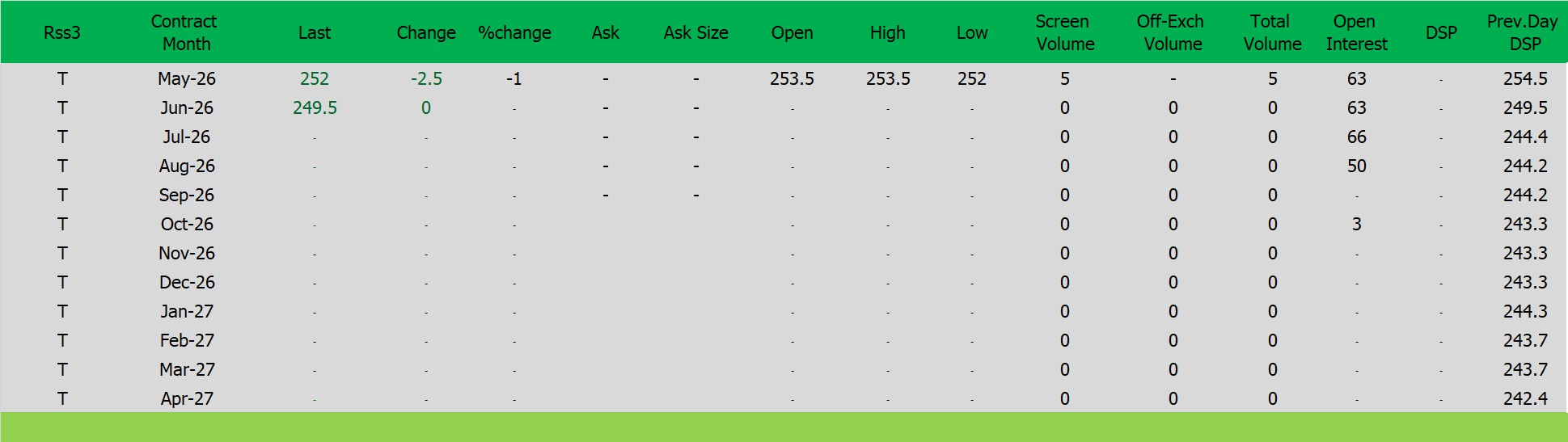 ราคาปิดตลาดยาง SICOMประจำวัน พุธ ที่ 8เมษายน2569ราคายาง RSS3 ราคาเดือนพ.ค. ราคาลดลง -2.5เซนต์สหรัฐ ปิดที่ 252 เซนต์สหรัฐ