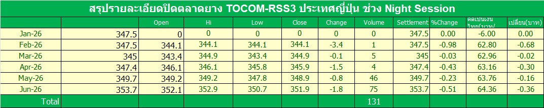 TOCOM-RSS3 ปิดตลาดช่วง Night Session  ประจำวัน พุธ ที่ 7 มกราคม 2569 ราคาเดือน มิ.ย.-2026ปิดตลาดที่ 351.90 ลดลง -1.8เยน   ปริมาณ 75 สัญญา